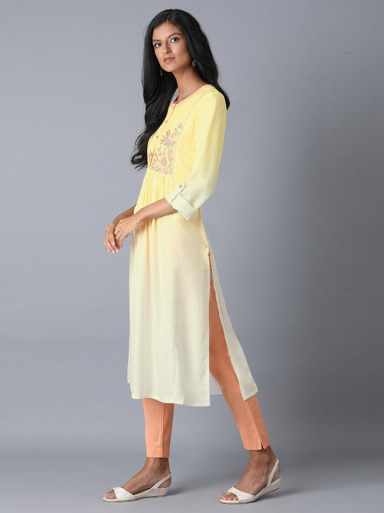 - Yellow and white yoke design straight kurta, has a round neck, three-quarter sleeves, straight hem, button closure and side slits