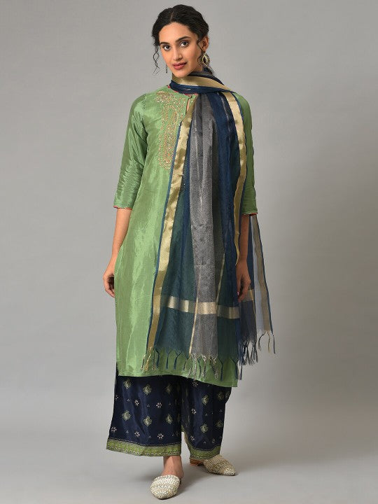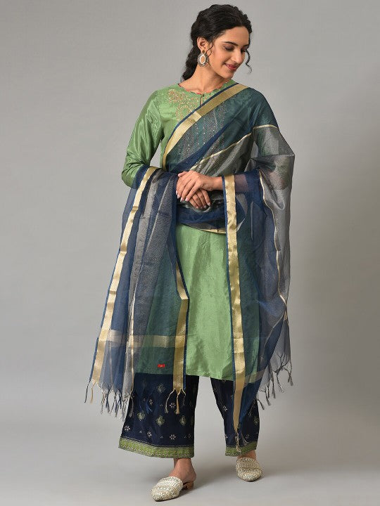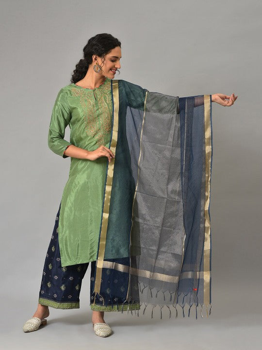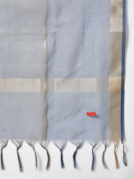Product Details: Blue and gold-toned solid woven design dupatta zari, tasselled border Size & Fit: Length: 2.40 m Width: 80 Cm Material & Care: Fabric Name : Organza Fabric Composition :...