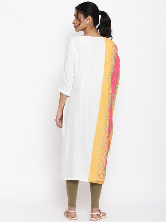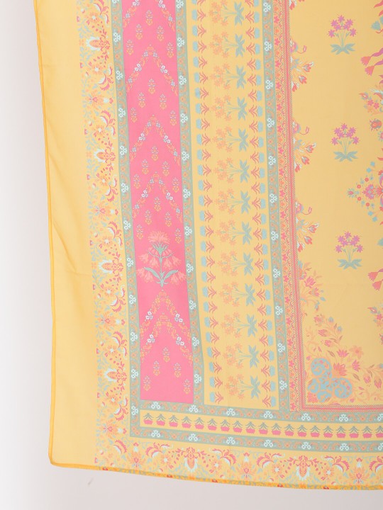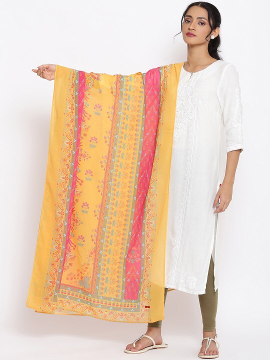 Product Details: Yellow and pink floral printed dupatta, taping border Size & Fit: Dupatta Length: 2m Material & Care: Poly Chiffon Machine Wash