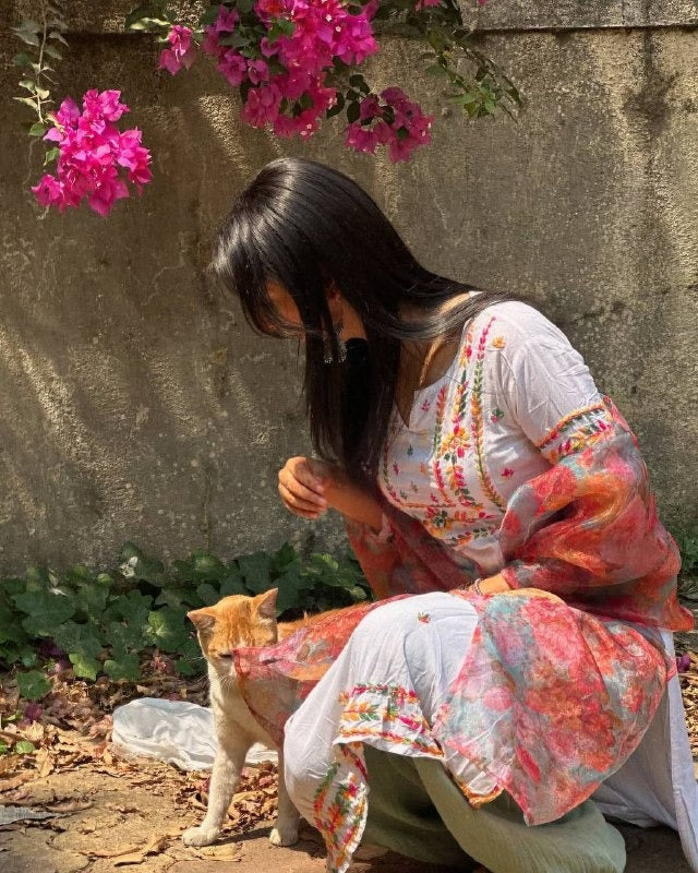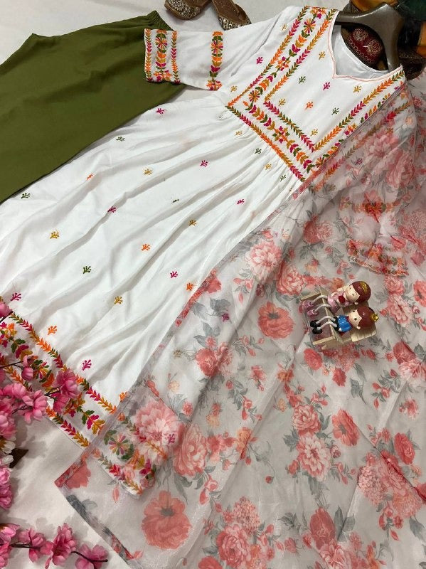White Embroidered Anarkali Set with Olive Pants & Floral Organza Dupatta